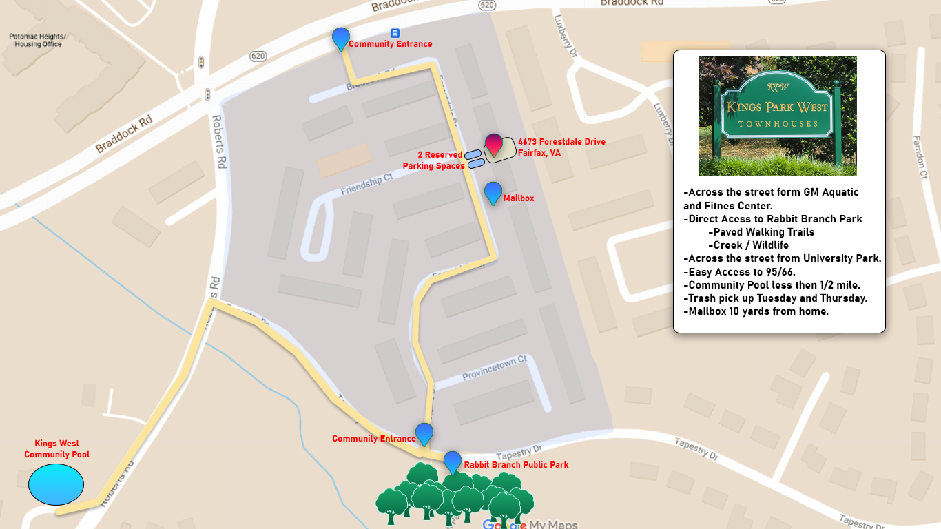 -3 level brick townhouse comes with 4 large bedrooms, 3 and an half bathrooms, filled with natural lights and matching contemporary color tones. -Fully finished basement with a large guestroom/office/gym whatever you wish to be and ample of space for storage as well. -Master bedroom over looking mature trees and all bricks patio/backyard lots privacy. -Modern kitchen opens to breakfast area leads to level all bricks backyard sensational England feels. -2 Assigned Parking Spaces -Highly desire Kings Park West, right across from GMU, minutes to Shopping center, City of Fairfax. .etc. -Trash pick up Tuesday and Friday, Recycling Tuesday |